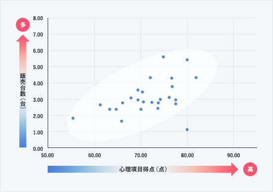 下の2つの散布図(対人関係心理スコア×販売予測台数)で分析結果を表しました。