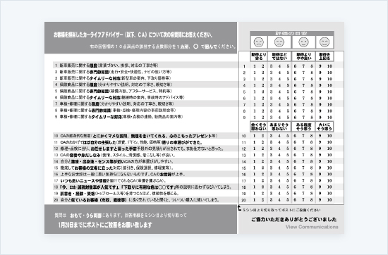 まず、全セールスマン500人から選抜された若手セールス中心の30人を対象にお客様への心のボタンアンケート(注2)を実施しました。 アンケートは、セールスの基本動作(接客態度、専門知識等)や心のボタンへの作用状況について100点満点できいたものです。