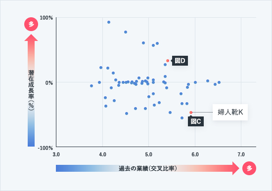 業績分析より他の主力ブランドの予測結果を見ると、図Dのように高価格帯で伸びるものがあり、バイヤー解説に説得力があるようには見えませんでした。