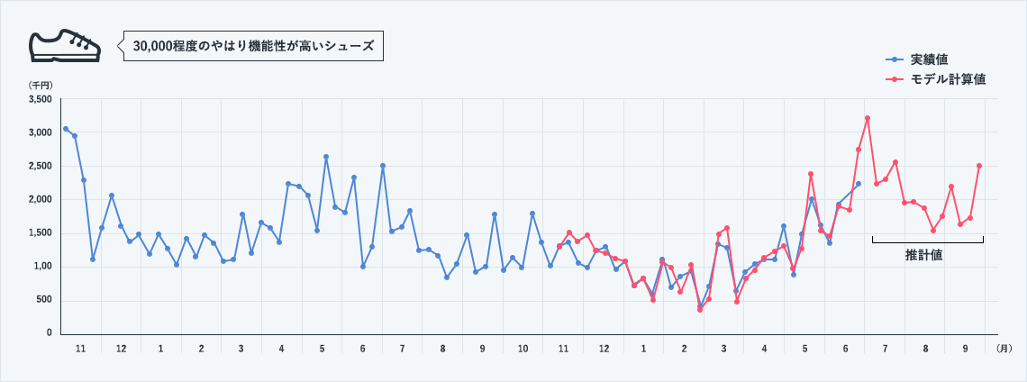 婦人靴Kは、これまでの業績では主力ブランドの1つでしたが、ここ半年ほど低迷が続いていました。今後の売上高の予測を作ってみたのが図Cです。
