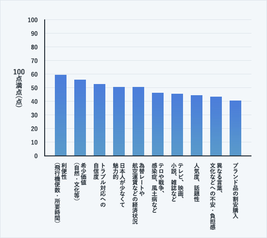 旅行者心理(旅行先を決める際に影響を受けたことや重視したことなど)の集計結果(100点満点)から探ってみることにします。