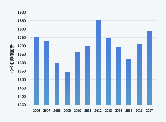 近年の訪日外国人の急増に比べ、海外旅行に出かける日本人の数は、年により上下変動はあるものの増えているわけではありません。