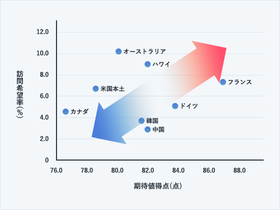 観光スポット、グルメ、宿、ショッピングなど旅先への期待を測定し、100点満点で期待値として評価したものです。