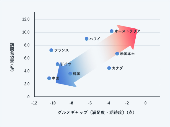 国別に期待値と満足度を比較したところ、に「カナダ」「フィリピン」を除くすべての国・地域で、期待値を満足度が下回る結果となり、特にギャップが大きいのは「フランス」 「中国」でした。