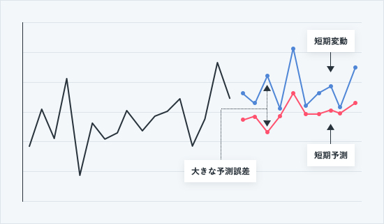 規則的変動については、パラメーター推定を正確に行うことで予測精度は確保されますが、(不規則変動)については予測不能なので、予測は、