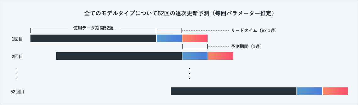 過去の販売実績(2017年12月50週まで174週)を用いて、リードタイム3週として1月1週に販売するであろう値をD52モデルのもとパラメーター推定して求めたものです。