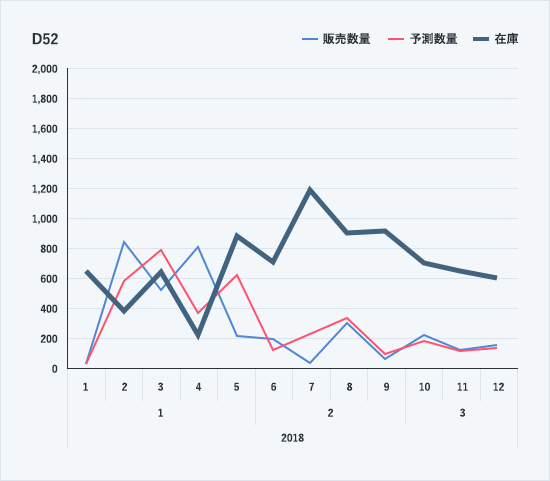 ここまで、平均在庫=安全在庫=|リードタイム累積誤差の最小値|と述べてきました。 実例を通じてこの公式の意味を説明しましょう。事例としては、先のリビング用品Bの販売予測2018年1月1週~3月12週モデルD52を用います。