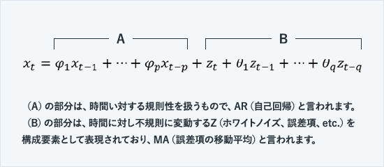 この方程式はARIMA(自己回帰移動平均統合)モデルと呼ばれ、観測データより、パラメーター