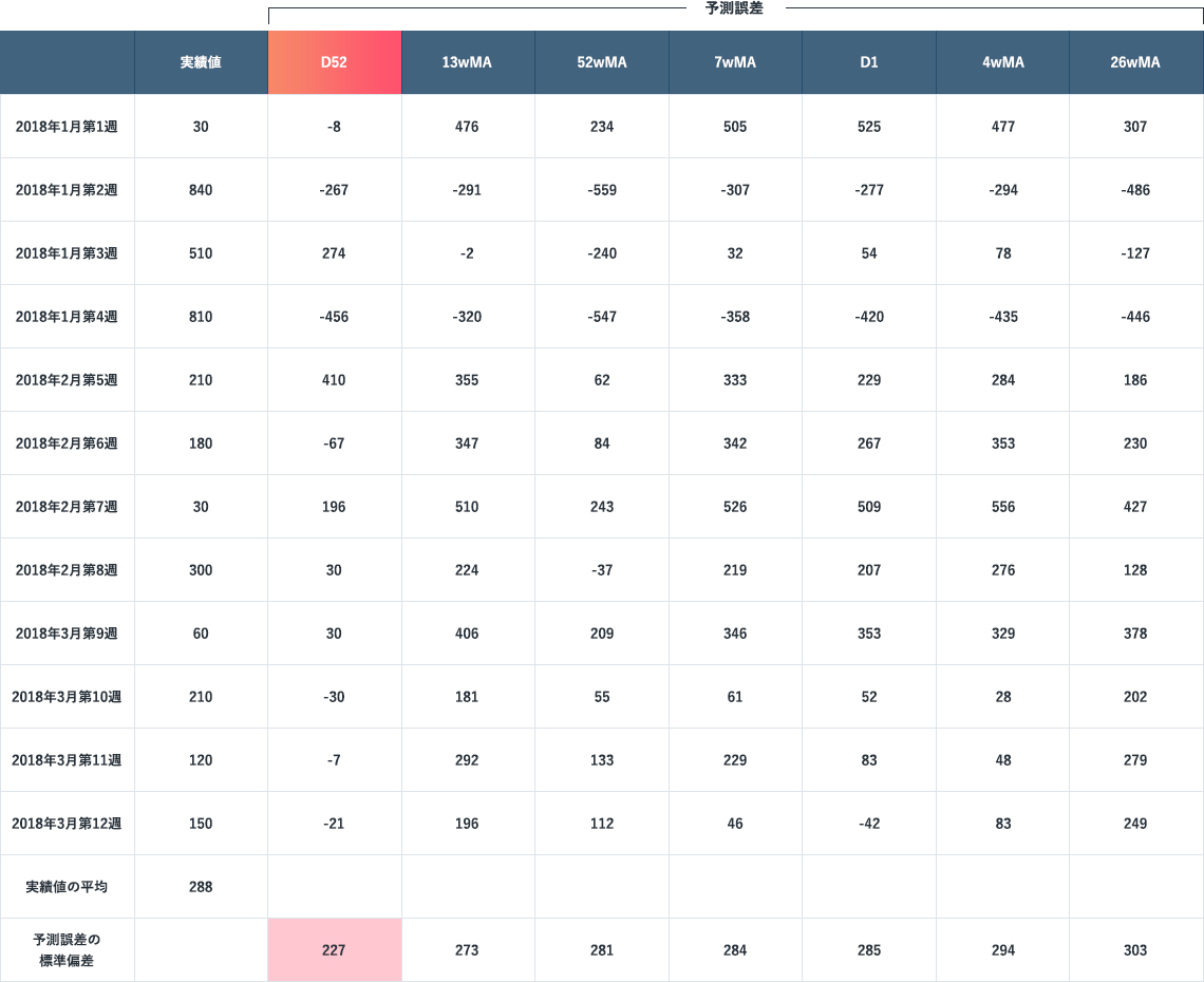 シミュレーションではなく、実際運用を想定し、2018年1週~12週の期間で各モデルを適用してみました。各モデルの予測結果(予測誤差)をまとめたのが上表です。